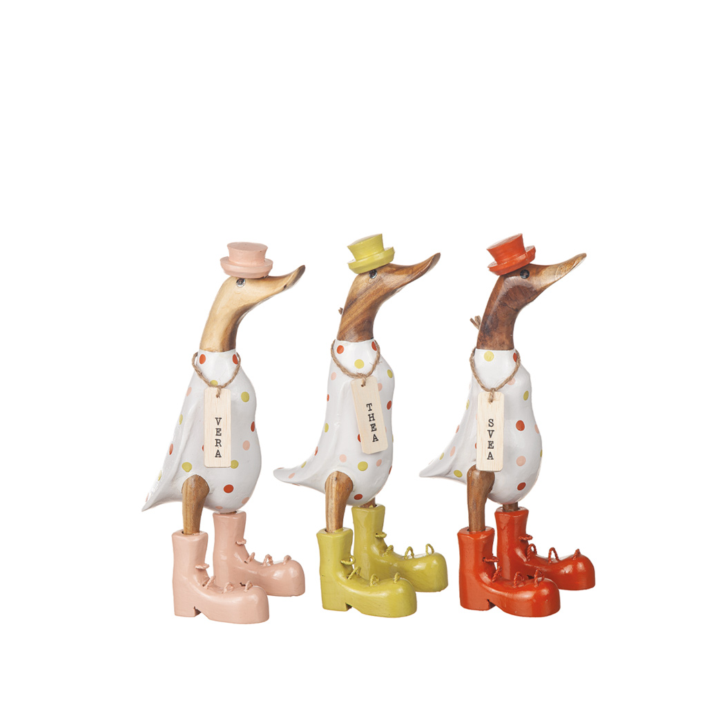 Fräck dekorativ ankan Lina, orange/vitrandig med stövlar och hatt.