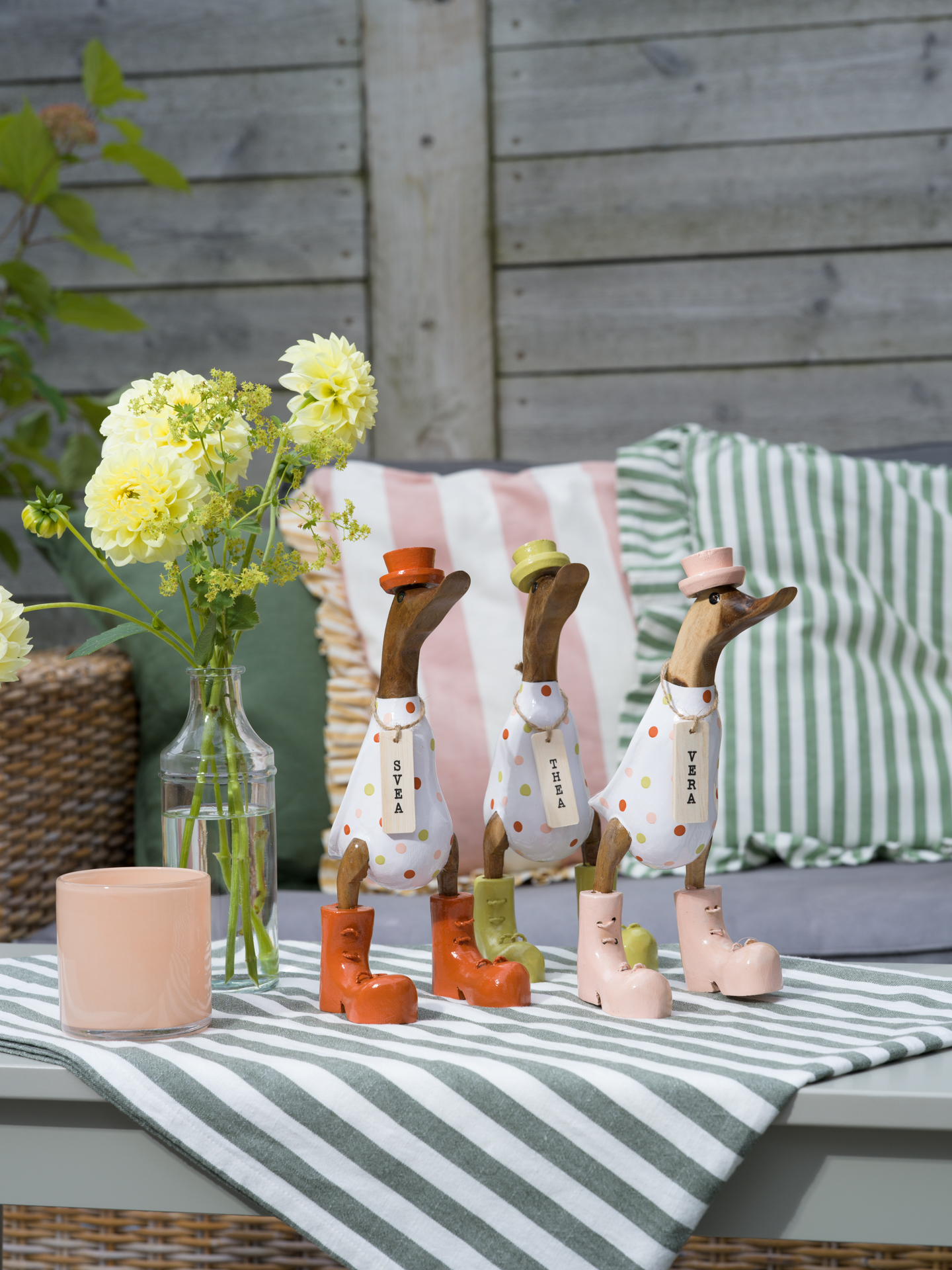 Fräck dekorativ ankan Vera, aprikos/rosa/prickig med stövlar och hatt.