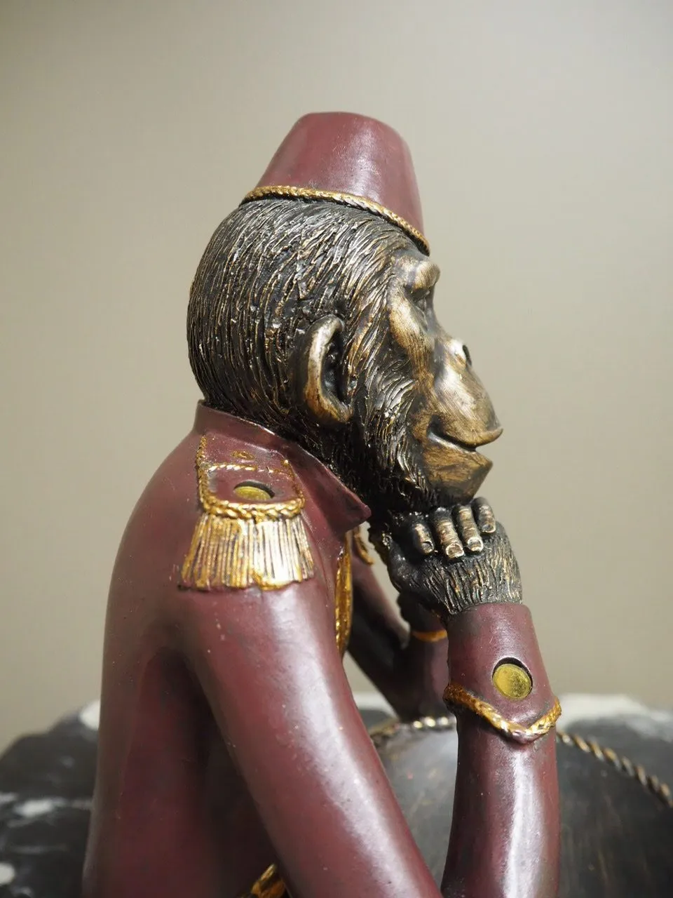 Apa i uniform sittande med skål i knät.