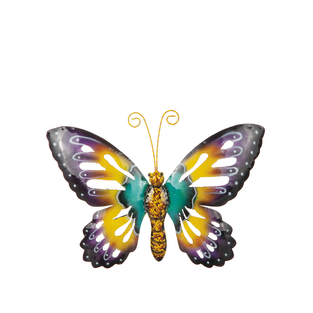 Vacker väggfjäril i hamrad plåt i färgerna lila/gul/grön mix.