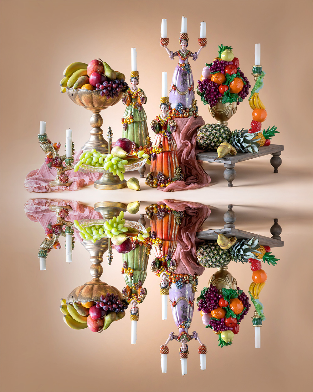 föreställande en kvinna i klänning med olika frukter.